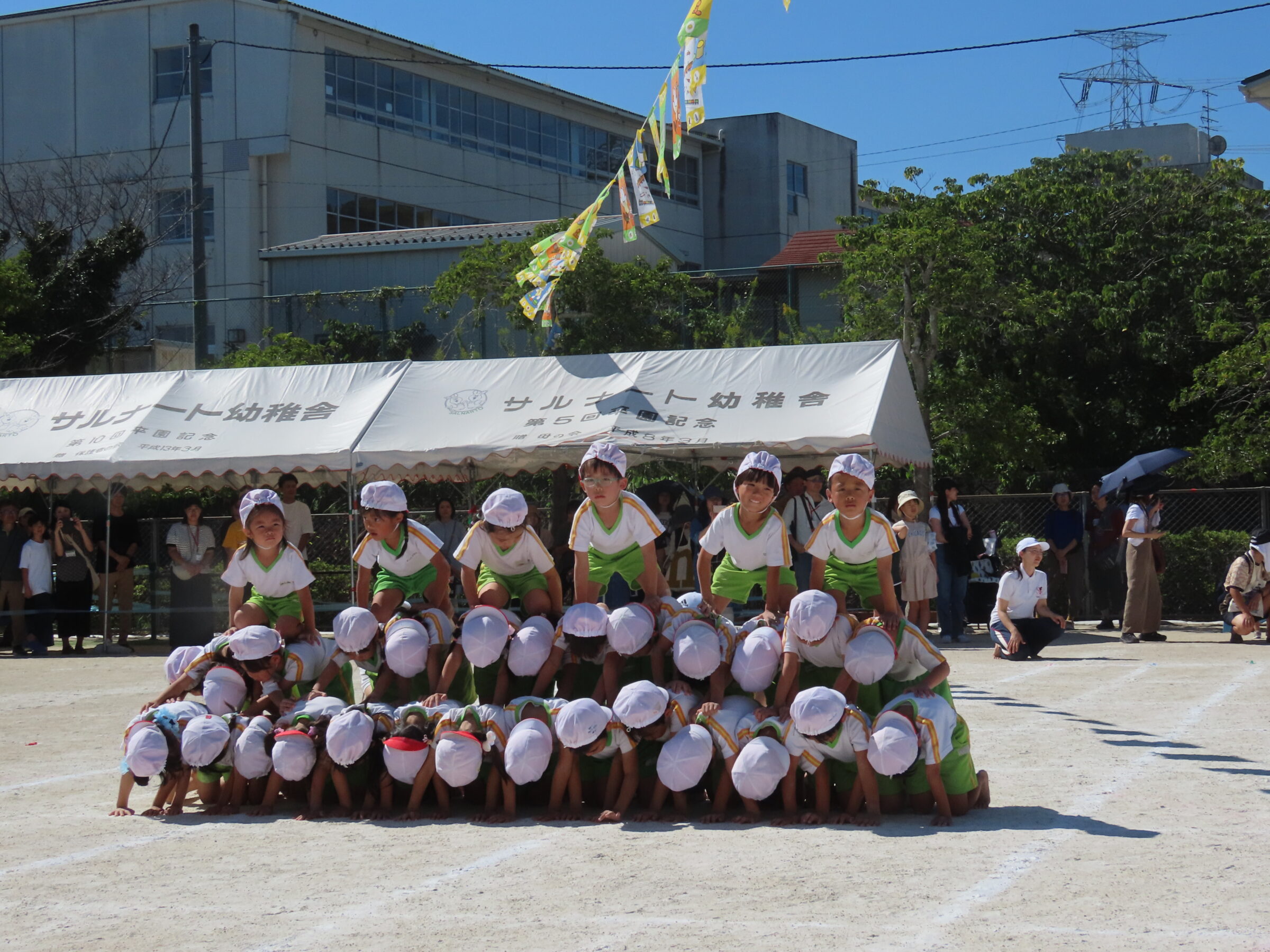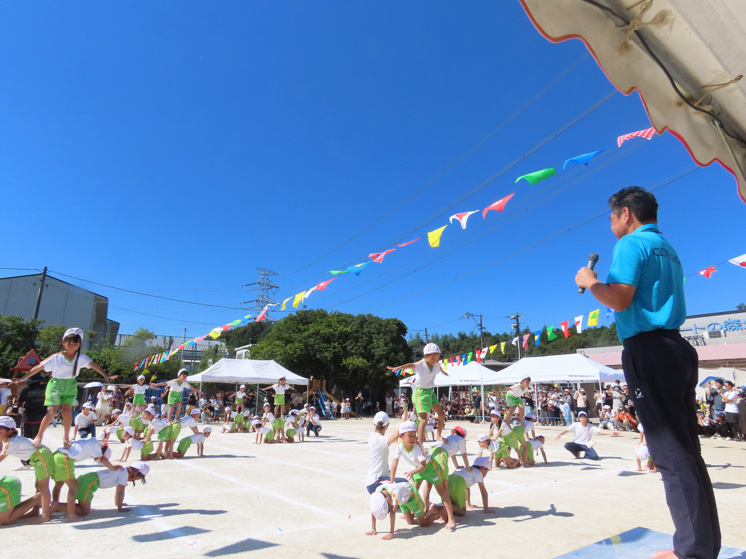 組体操では、笛の合図に合わせて素早く移動したり、友だちと力を合わせて技を決めていく年長さん✨
